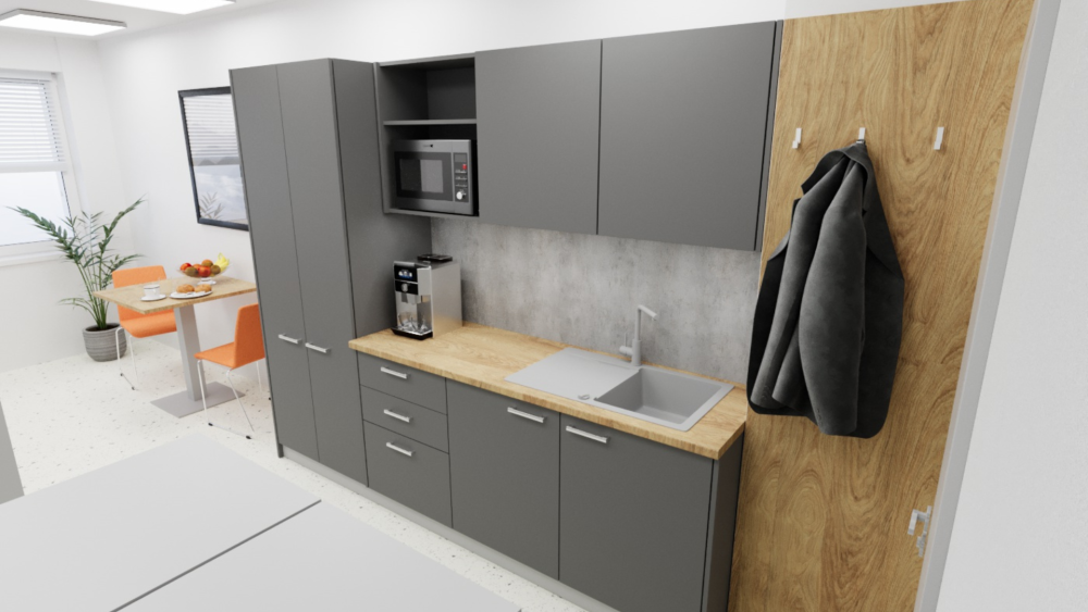 Nábytok na mieru: Použili sme kombináciu dreva a sivých plôch, ktoré pôsobia moderne a čistým dojmom. Pracovné stoly i skrinky sú navrhnuté tak, aby podporovali praktickosť a efektivitu každodenného fungovania.