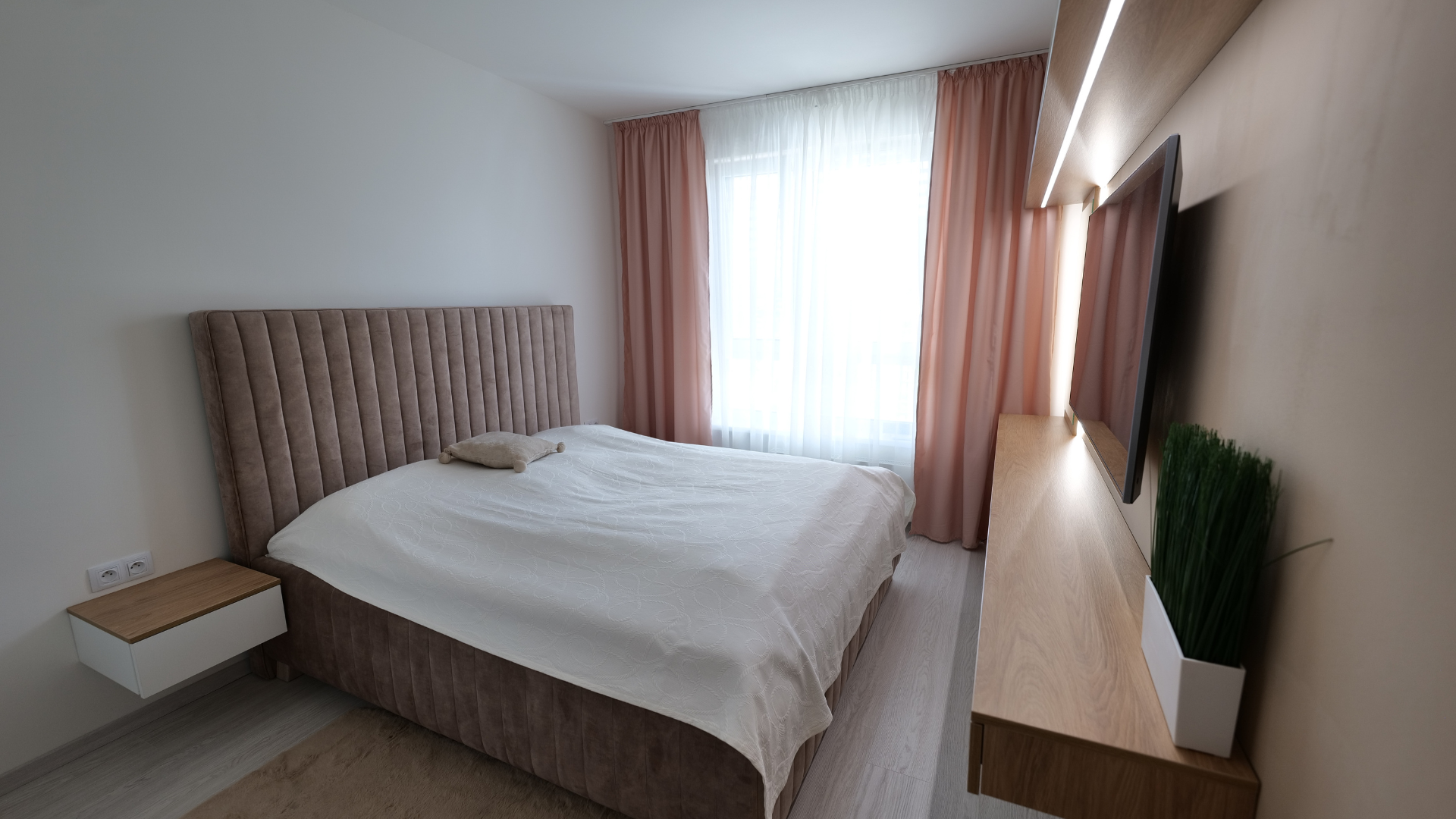 Jemné odtiene svetlého dreva a decentné zelené doplnky sa v priestore spájajú ako dotyky prírody, ktoré prispievajú k pocitu pokoja a rovnováhy. Tento byt je zhmotnením predstáv, ktoré sme pretavili do interiéru na mieru.