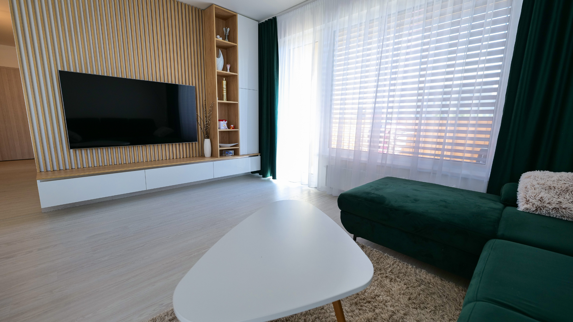 V tomto prípade sú detaily dušou celého priestoru. Jemné zelené doplnky, ako závesy či dekorácie, sú ako malé odtlačky prírody, ktoré osviežujú celý byt. Svetlé drevo a jemné farby tak vytvárajú elegantnú scénu, na ktorej sa tieto prvky stávajú nenahraditeľnou súčasťou.