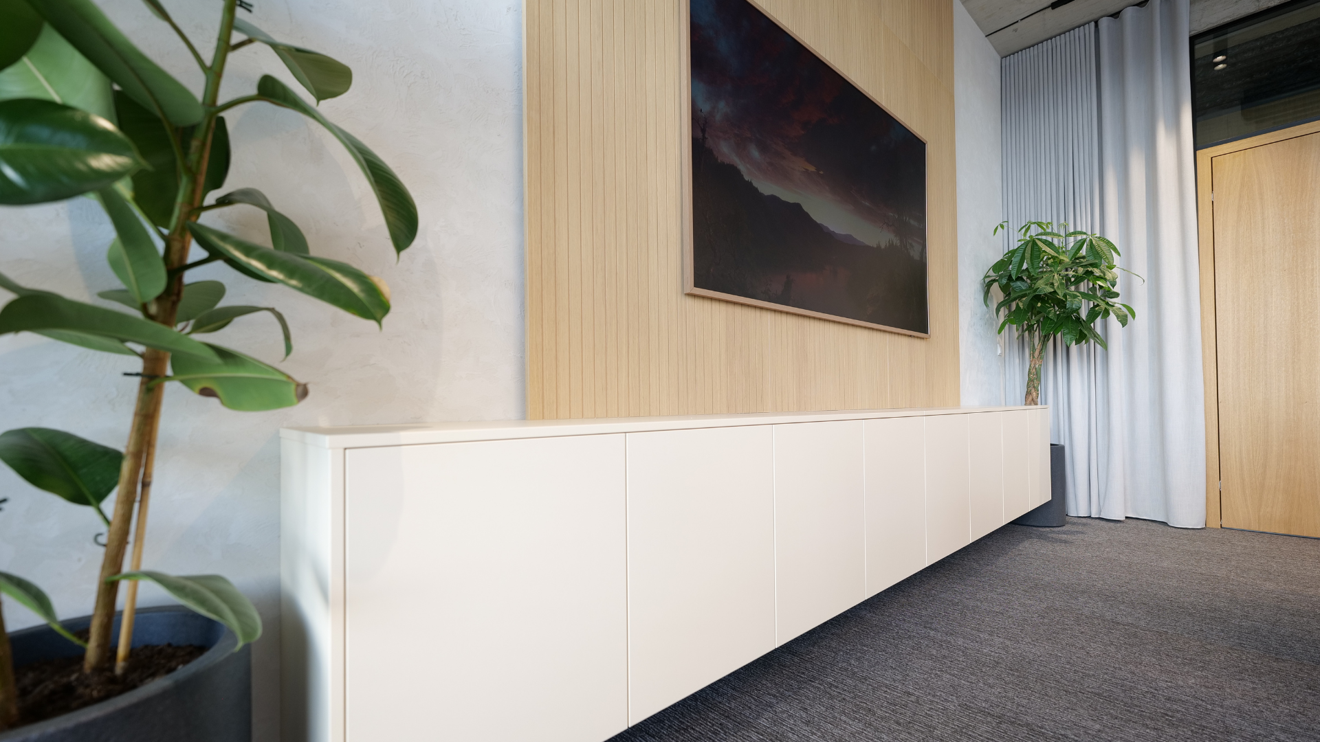 Celý dizajn sme stavali na princípoch udržateľnosti. Výber kvalitných materiálov, ktoré sú nielen estetické, ale aj ekologické, podporil záväzok Fuchs Oil k zodpovednému podnikaniu. Dominantným prvkom je drevený obklad v tvare oblúka, ktorý prechádza pozdĺž celej chodby, a zároveň zakrýva skryté dvere, čím vytvára dojem čistoty a harmónie.