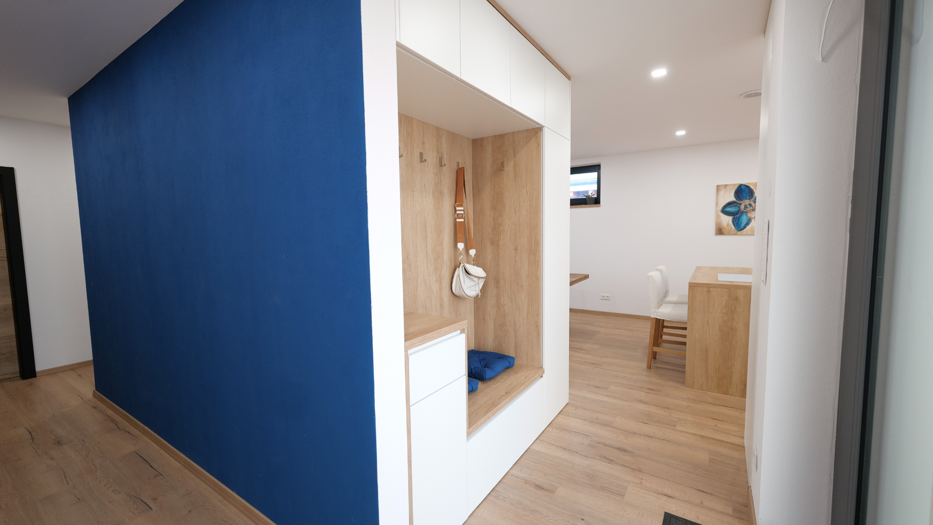 Chodba, ktorá spája kuchyňu s obývačkou, bola navrhnutá ako plynulé prepojenie celého interiéru. Kombinácia bielych stien a drevených prvkov vytvára príjemný kontrast a modré akcenty pokračujú aj v tomto priestore, čím sa zabezpečuje konzistentnosť dizajnu.