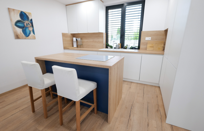 Ťažiskom projektu bolo riešenie kuchyne s obývačkou, ktoré sú napojené otvoreným priestorom na chodbu. Kuchyňa bola navrhnutá s dôrazom na praktickosť a estetiku, pričom skryté dvere do špajze dodali priestoru čistý a elegantný vzhľad.