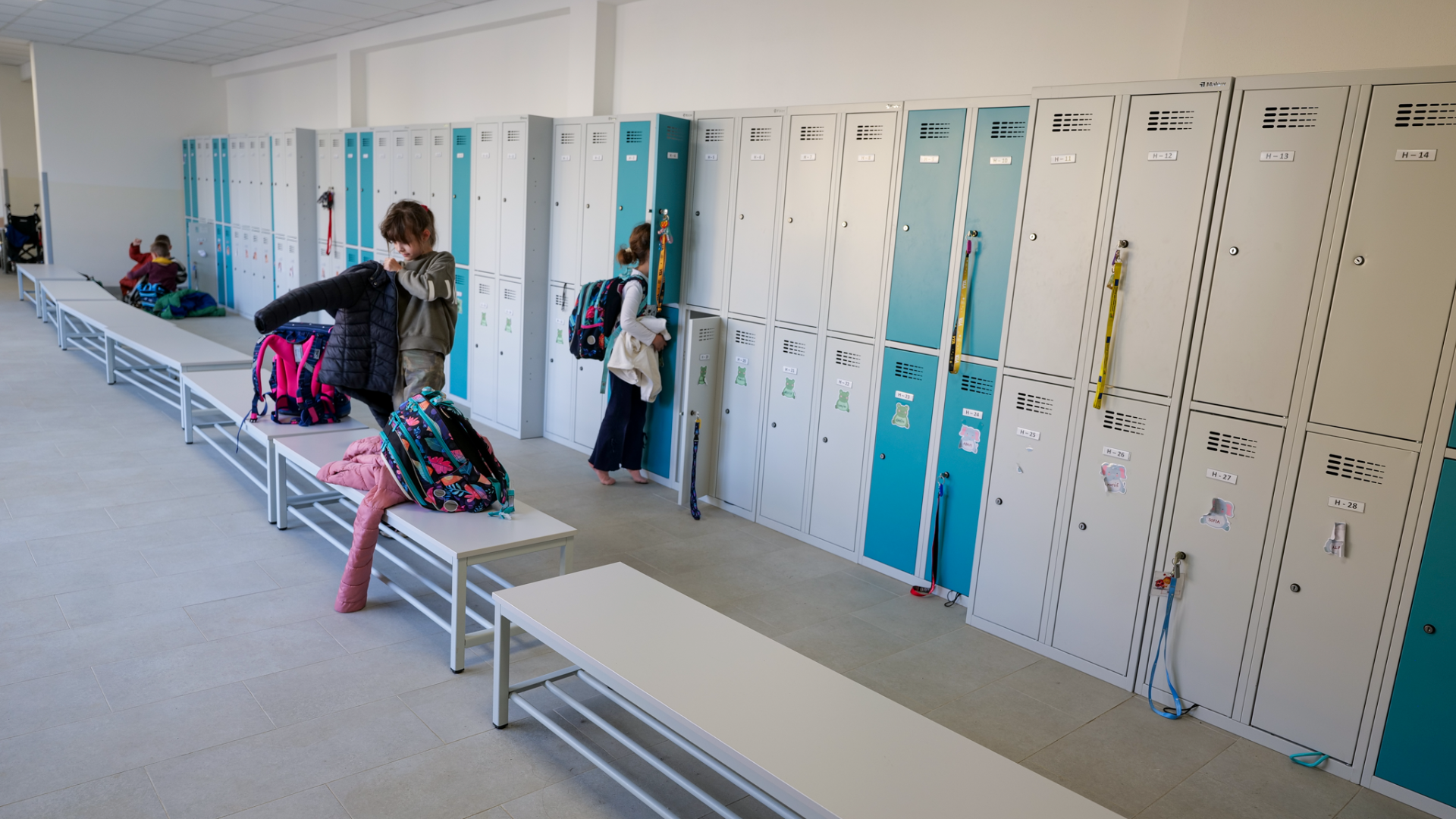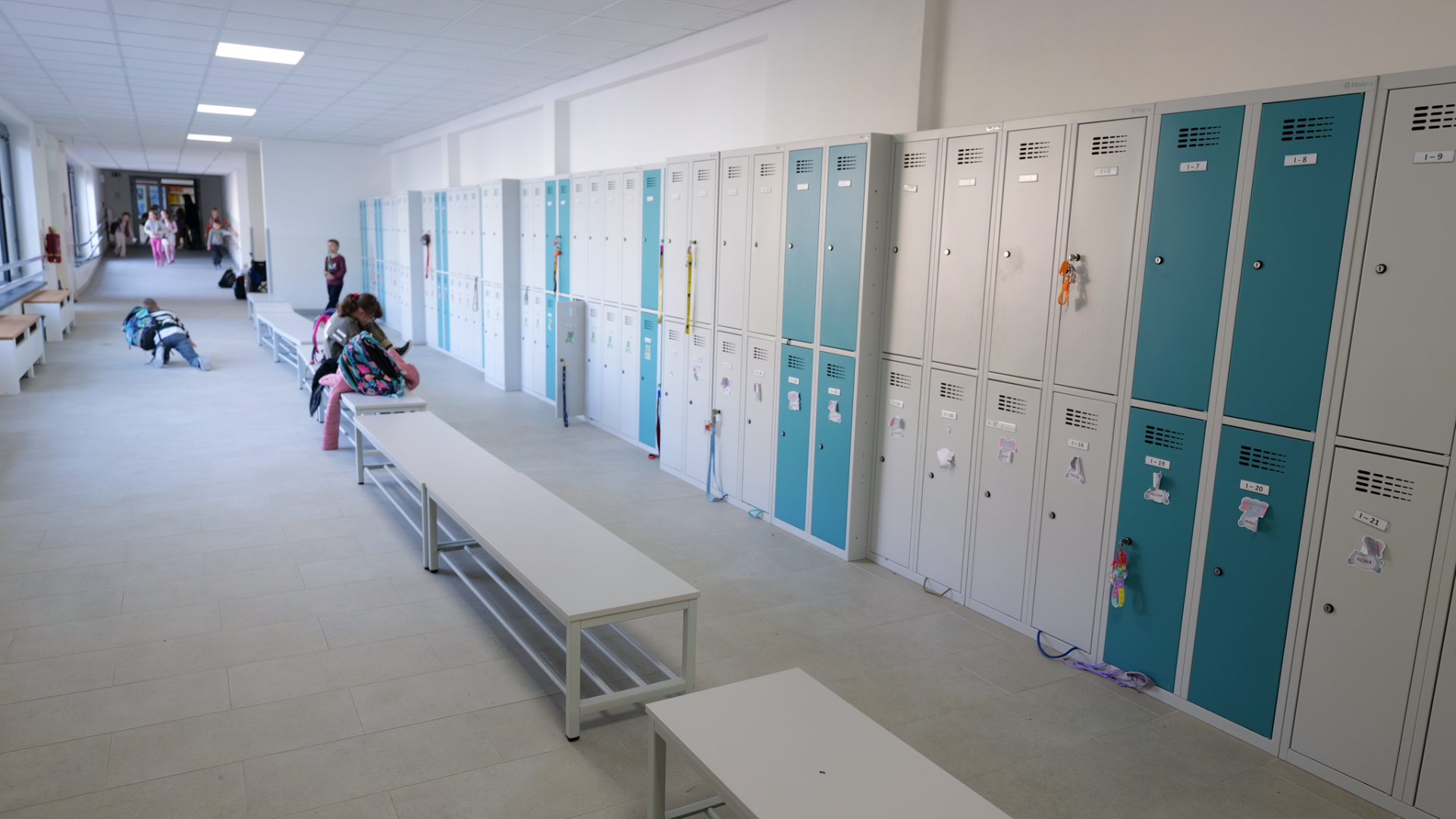 Dlhé lavice s odkladacím priestorom pre topánky zabezpečujú poriadok aj v najvyťaženejších hodinách. Chodba pôsobí čistým, organizovaným dojmom, hoci ju denne prechádza desiatky detí s batohmi podstatne väčšími než oni.