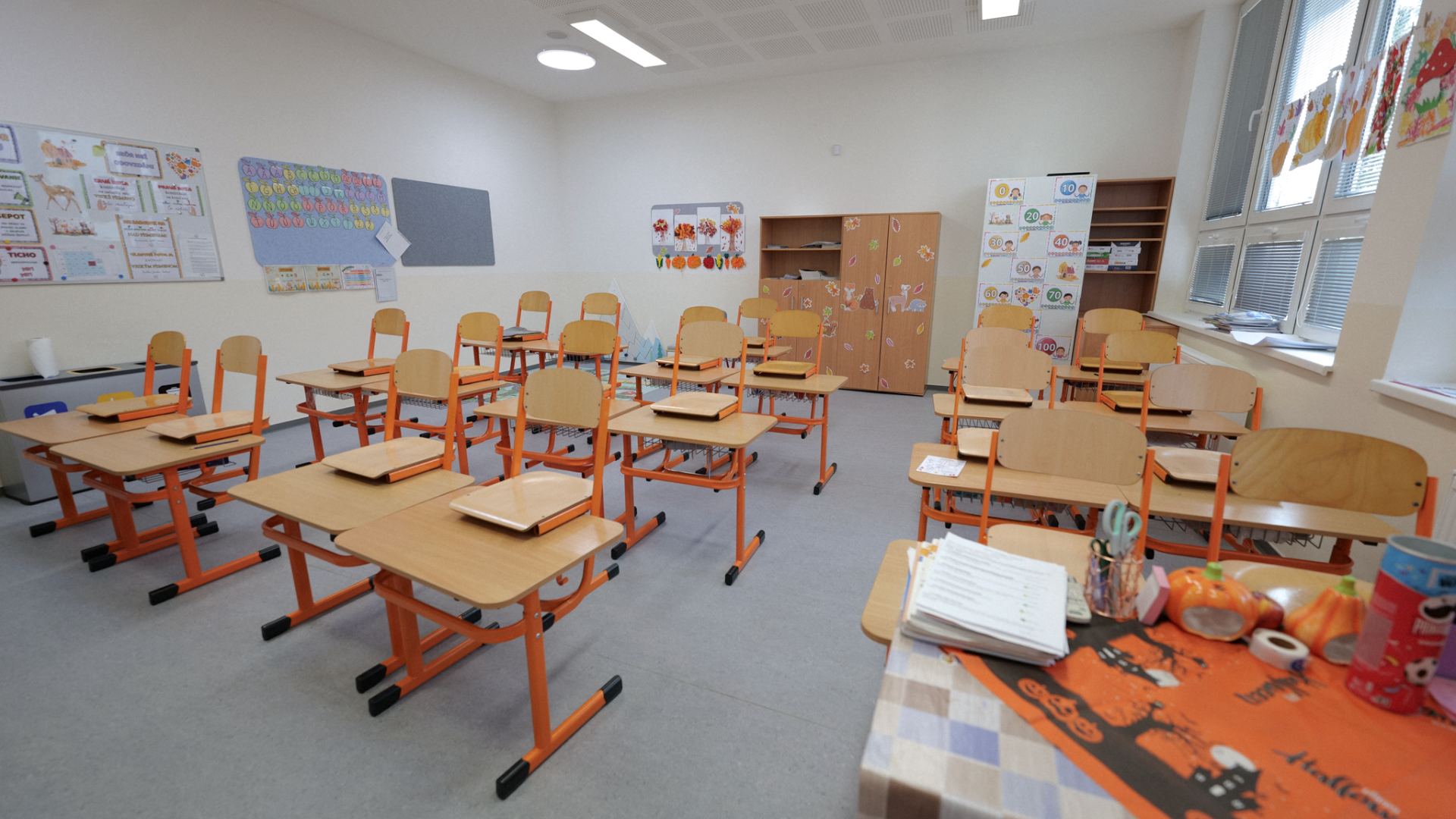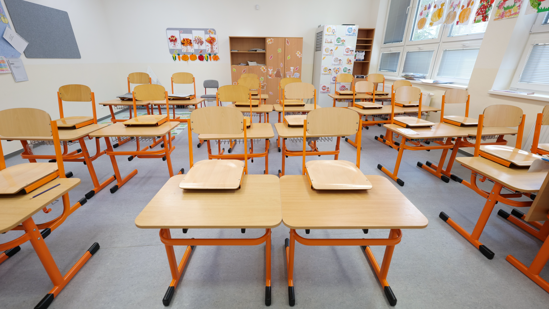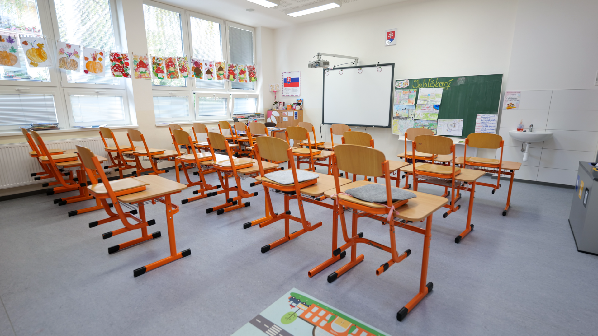 Do tried sme dodali odolné školské lavice a stoličky v príjemnej kombinácii prírodného dekoru a oranžovej konštrukcie. Všetko pôsobí sviežo, hravo a zároveň upratane. Stoličky sú ergonomické, ľahké, takže deti vedia rýchlo „vyložiť nohy“ stoličkám na stôl pri upratovaní. Lavice majú pevnú konštrukciu a odkladacie košíky, presne to, čo v škole funguje bez kompromisov.